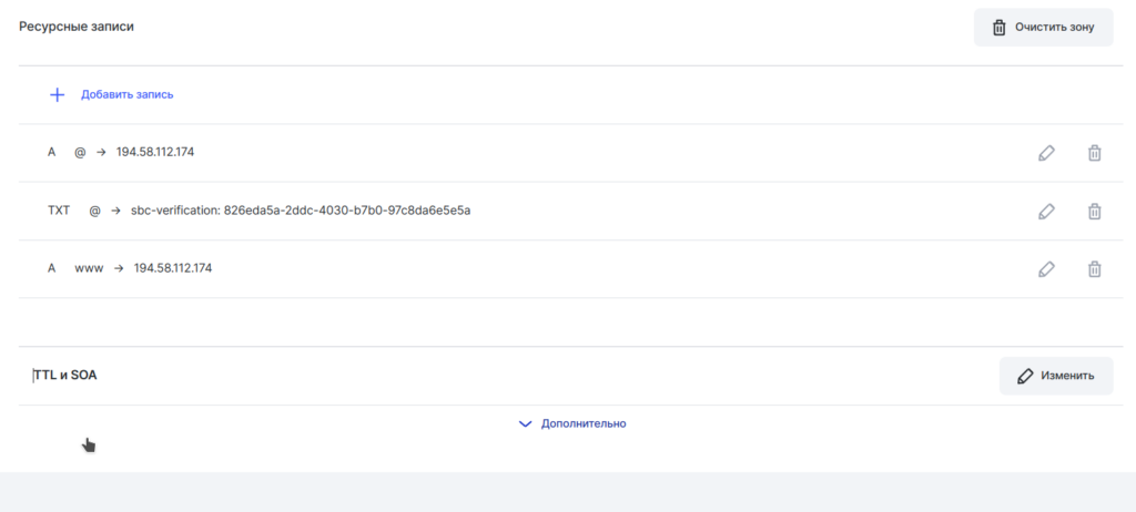 . Данное значение необходимо скопировать со страницы созданной зоны. Обратите внимание, что в запись добавляется полное значение следующего формата — sbc-verification: 4a420000-4700-000d-a0f0-8b71933f0000.