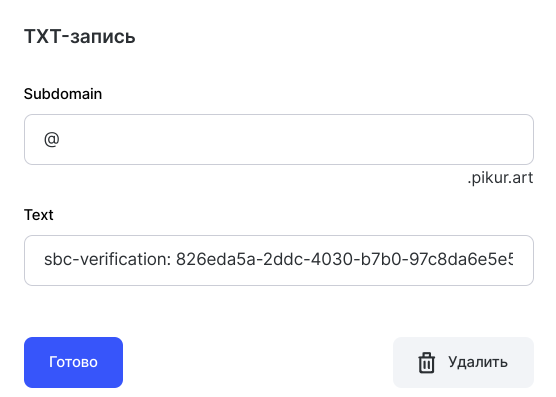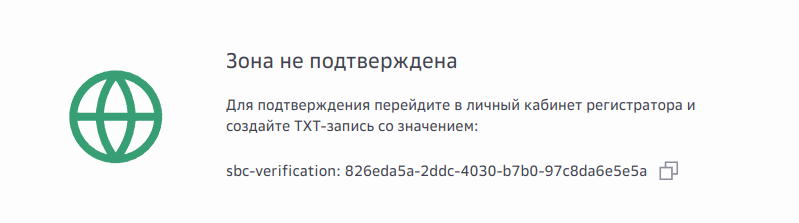 Чтобы подтвердить зону, в личном кабинете вашего доменного регистратора добавьте TXT-запись со значением