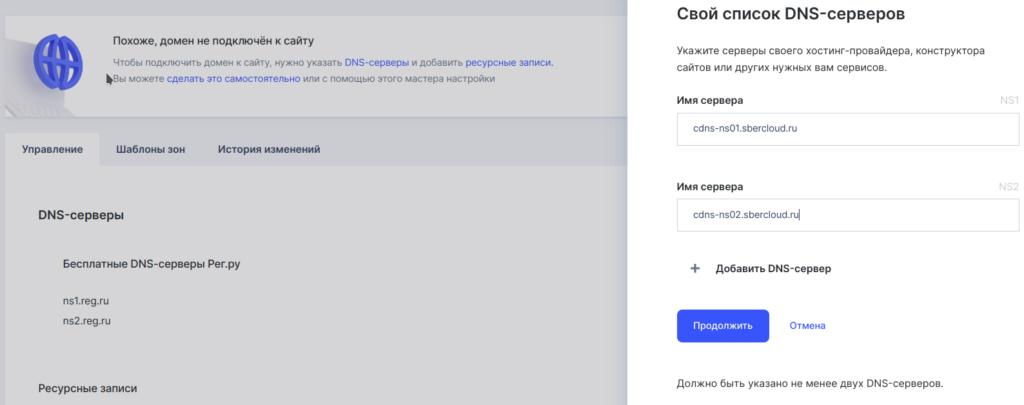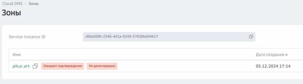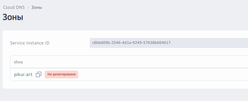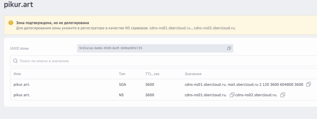 Статус «Ожидает подтверждения» пропал и теперь нам надо делегировать нашу зону указав в рег.ру днс-сервера сбер-клауда.