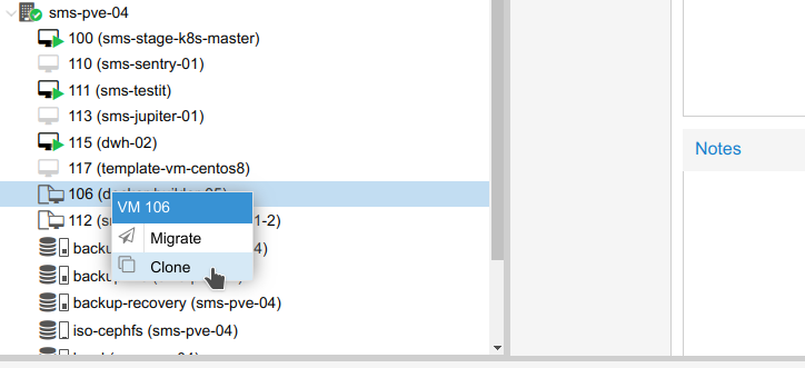 Рассмотрим последовательность операций для клонирования виртуальной машины средствами web-интерфейса Proxmox.