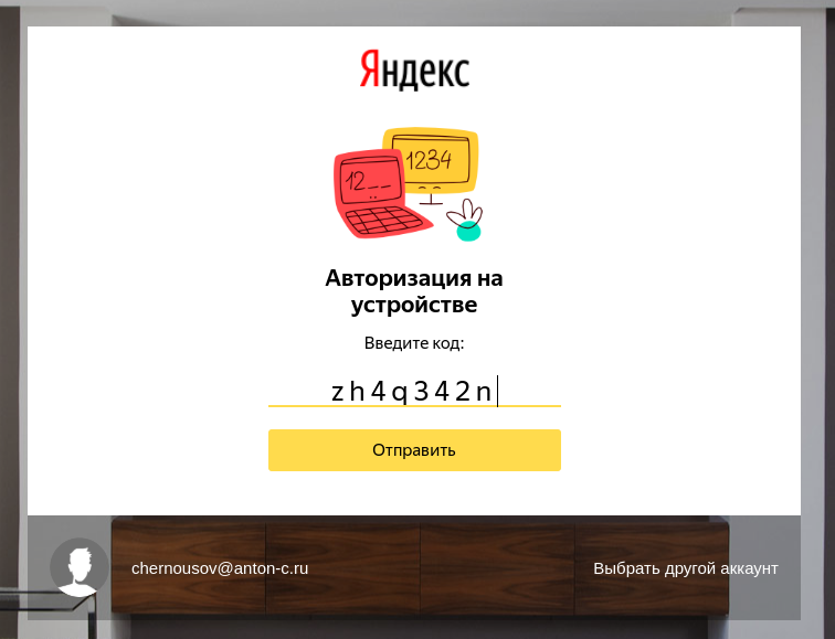 Go to the page https://ya.ru/device and enter the code ‘zh4q342n’ within 300 seconds. Make sure you're logged in to the browser with the right account.Token saved to /home/chernousov/.config/yandex-disk/passwd