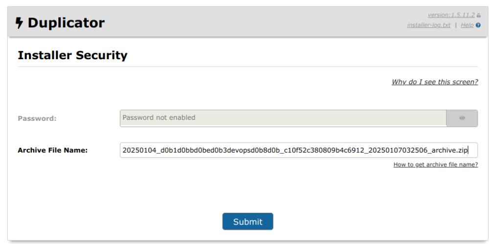И дальше в браузере открываем дарес нашего сайта, но не index.php, а installer.php (что логично) и указываем имя архива, после чего подтверждаем.