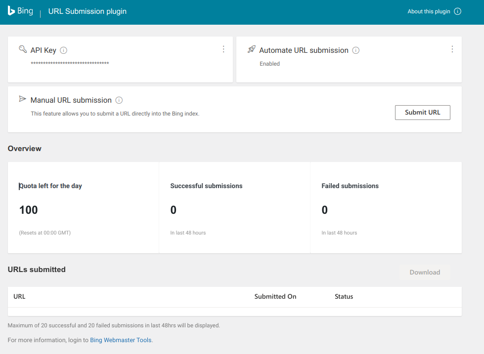 Указываем API-ключ полученный в Bing и новый контент автоматически отправляется на индексацию в Bing и не ждем пока он сам к нам придет.