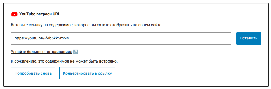 Вот казалось бы, что может быть проще и даже виджет есть специальный в разделе «Медиа» для встраивания видео и даже отдельный виджет для Youtube в разделе «Вставки», а вот воспользоваться ими не получится и вы получите ошибку «К сожалению, это содержимое не может быть встроено.«