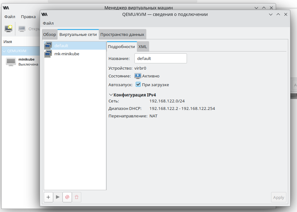 Переходим на вкладку «Виртуальные сети» и видим, что сеть default это сеть типа NAT.