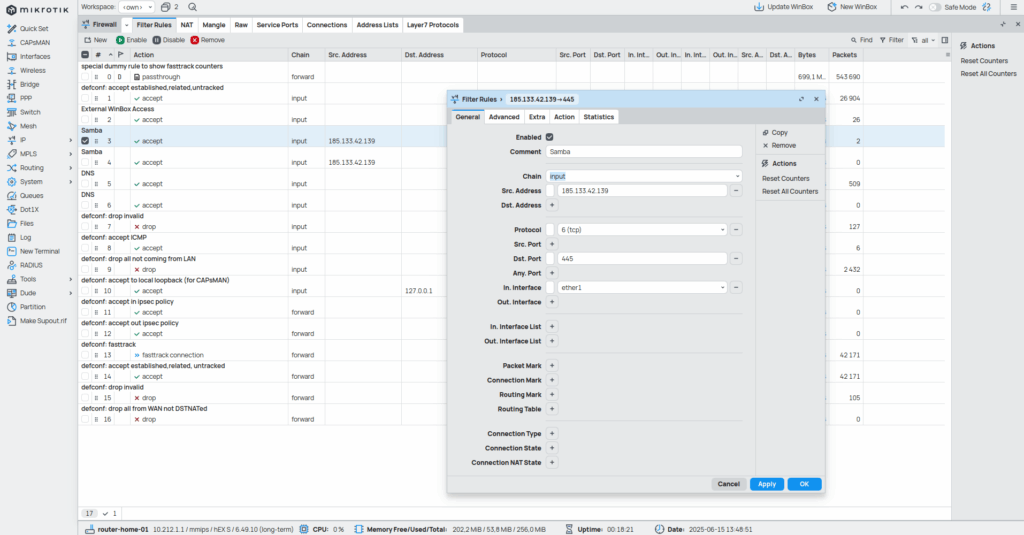 Открываем доступ к сетевому ресурсу SMB с двух IP-адресов (мои ftp-сервера). Сетевой ресурс это внешний жесткий диск подключенный к Mikrotik HEX-S и расшареный по протоколу SMB.