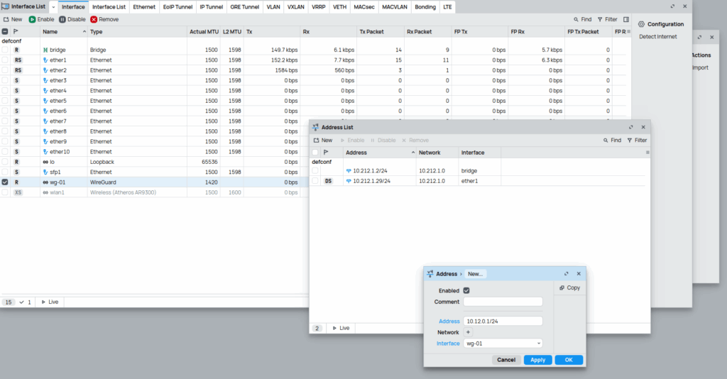 Фактически сейчас мы создали дополнительный интерфейс которому мы можем назначить адрес в разделе IP -> Addresses.