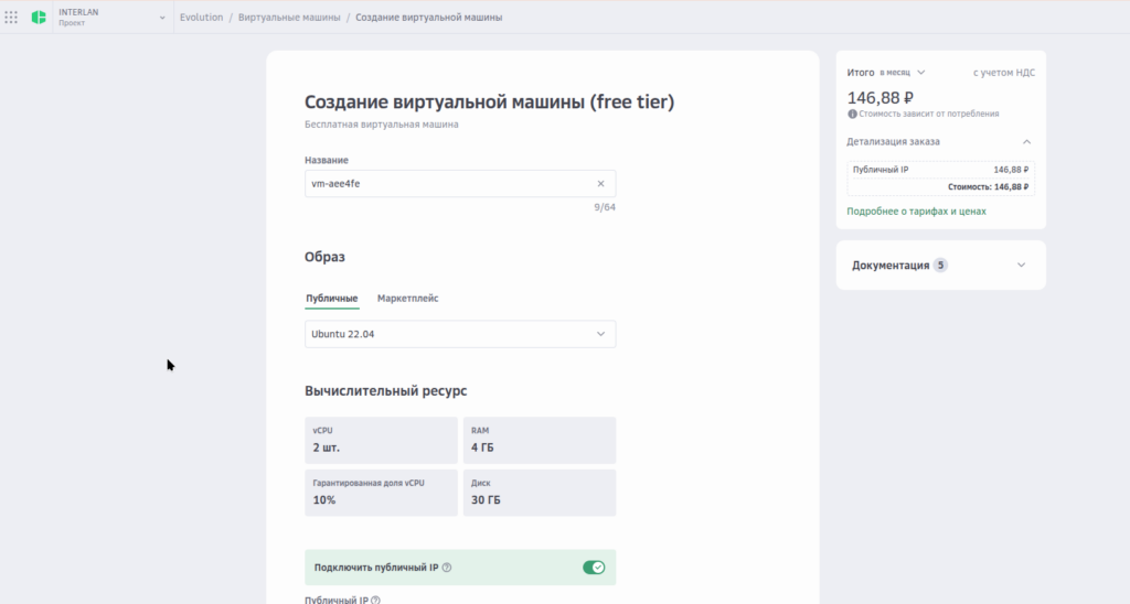 Одной из особенностей Cloud.ru Evolution является наличие FreeTier виртуальных машин и можно создать одну VM на аккаунт. По ресурсам получается очень даже неплохо по сравнению с такими же микро VM у других провайдеров. Из минусов, внешний статический адрес все же стоит денег, что и понятно.
