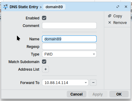 add forward-to=10.88.14.114 match-subdomain=yes name=domain89 type=FWD
