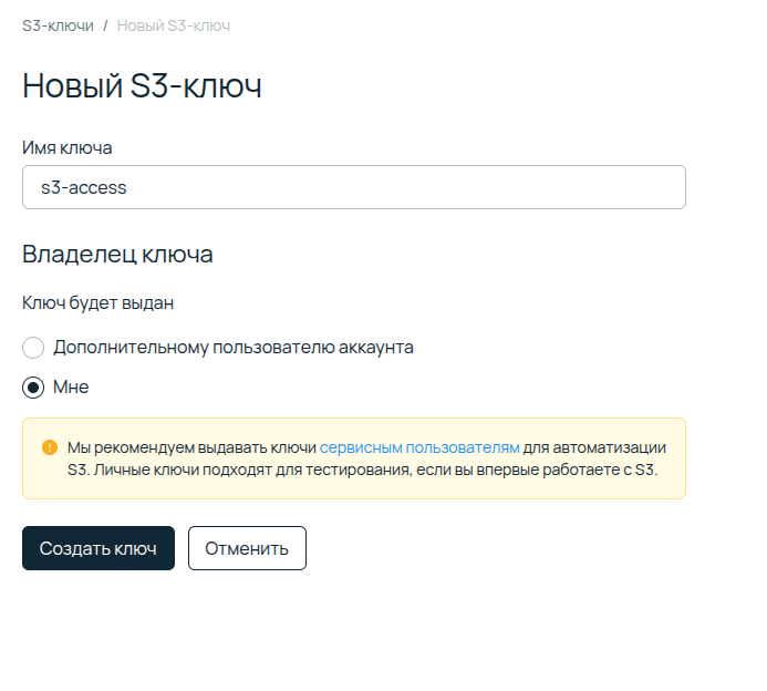 Для работы с S3 лучше создать сервисного пользователя, но мне для теста подойдет выдать самому себе. Полученный секретный ключ сохраните в хранилище паролей его больше не покажут.