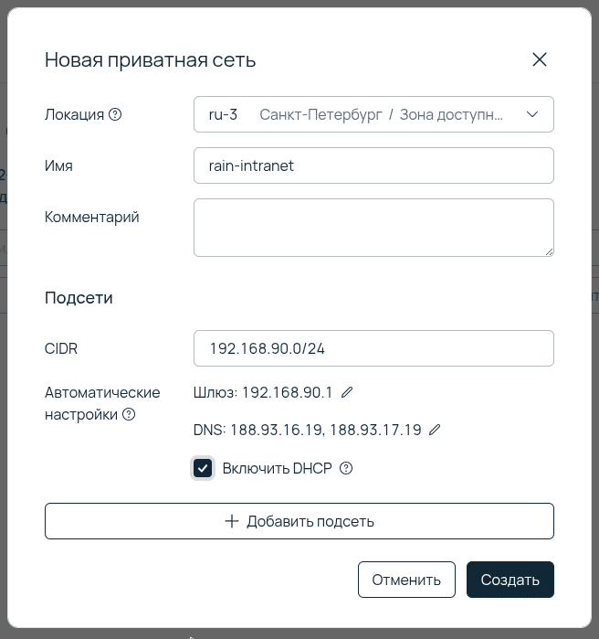 Переходим в раздел Облачные серверы -> Сеть -> Приватная сеть -> Создать сеть.